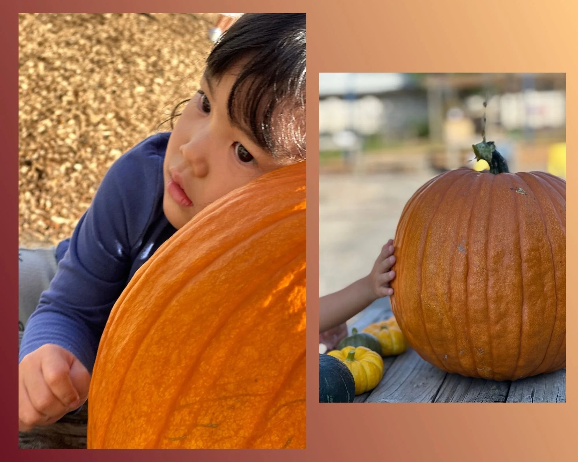 Minori Yamaki November 18, 2025 コン コン コン Minori Yamaki November 18, 2025 『先生、コン、コン、コンって言ってるよ。中に小人さんいるのかな?』小さな お耳をかぼちゃに当てて 中の様子を伺っています。小人さんたちも 冬の準備をしているのかもね。小さな 子供達の夢の世界大事な 大事な時間です